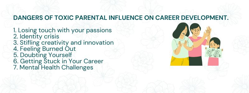 Toxic parental influence on career development can be really harmful. It’s risky because it can make you lose yourself. When you prioritize what your parents want over what you want, you can forget who you are and what you really want in life. Here are a few dangers of toxic parenting: