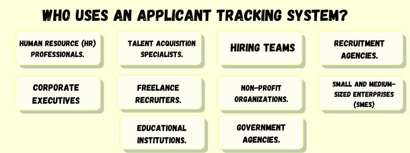 Companies of all sizes whether small or big use the ATS. They use the ATS to streamline and manage the recruitment process, from posting job openings, and scheduling interviews to onboarding new hires. Here’s a list of people who make use of the application tracking system;